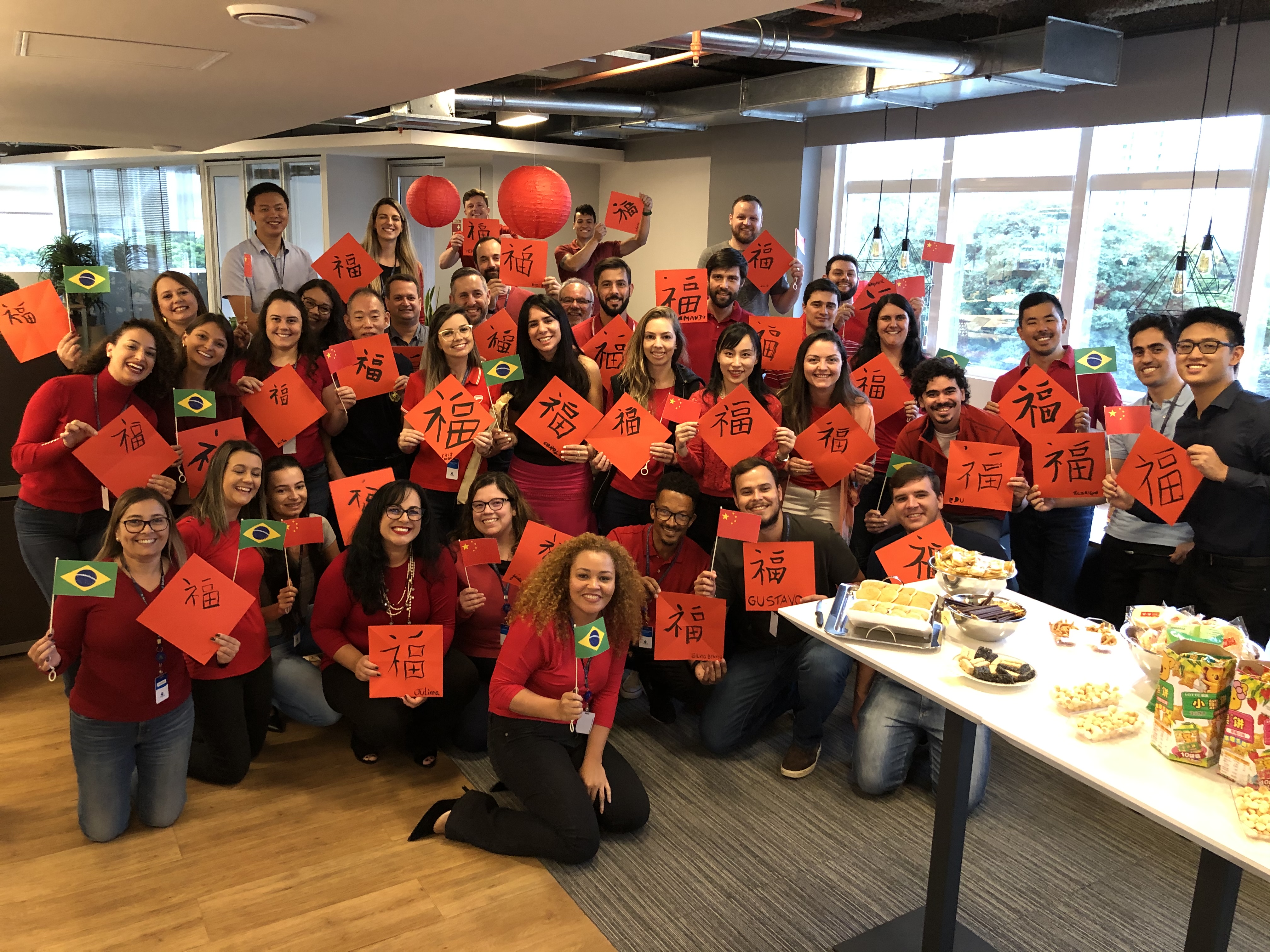 2020年1月17日,巴西公司組織“新春送福”活動(dòng)。圖為員工們展示作品合影